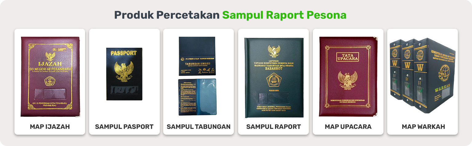 Produk kami mencakup beragam model map ijazah, sampul pasport, sampul tabungan, sampul raport, map upacara, map warkah, dan lainnya.